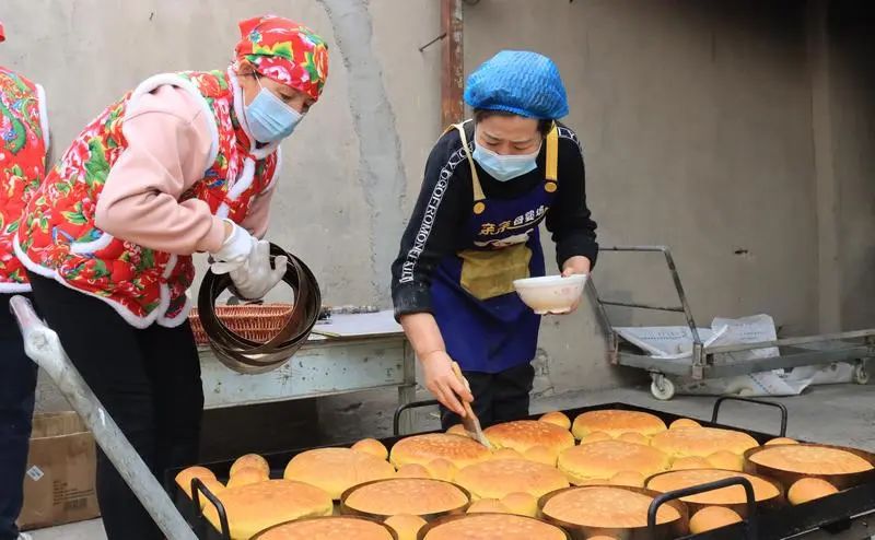 一聲響亮的吆喝,陳建華從土窯里拉出了一塊大鐵板。鐵板上,一個個金黃油亮的南瓜燒殼子和鍋盔冒著熱氣,麥香味頓時彌漫在空氣中。