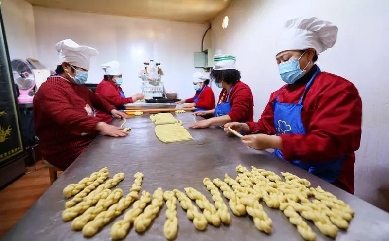 在位于中所溝村的肅州區(qū)鄉(xiāng)味食品坊,幾位大姐忙著和面。面粉里加入雞蛋、蜂蜜、牛奶、胡麻油后,搬進溫度適宜的房間醒發(fā)。醒發(fā)好的面團柔軟筋道,可制作成麻花、馓子、油果子等各類美味的年饃饃。