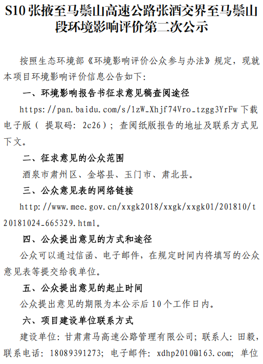 S10 張掖至馬鬃山高速公路張酒交界至馬鬃山 段環(huán)境影響評(píng)價(jià)第二次公示